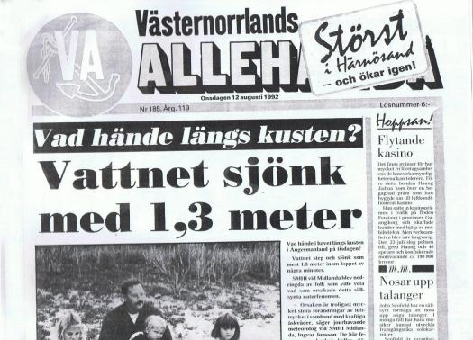 Den 11 augusti 1992 inträffade ett ovanligt och mycket intressant naturfenomen utefter kusten i Ångermanland. Det som hände ute på havet och vid kusten kallas sjösprång och är ett okänt begrepp för de flesta. Då sjönk och steg vattennivån med omkring 130 centimeter med intervaller på några minuter. Yrkesfiskaren berättade i en större artikel med flera bilder om detta sjösprång.
